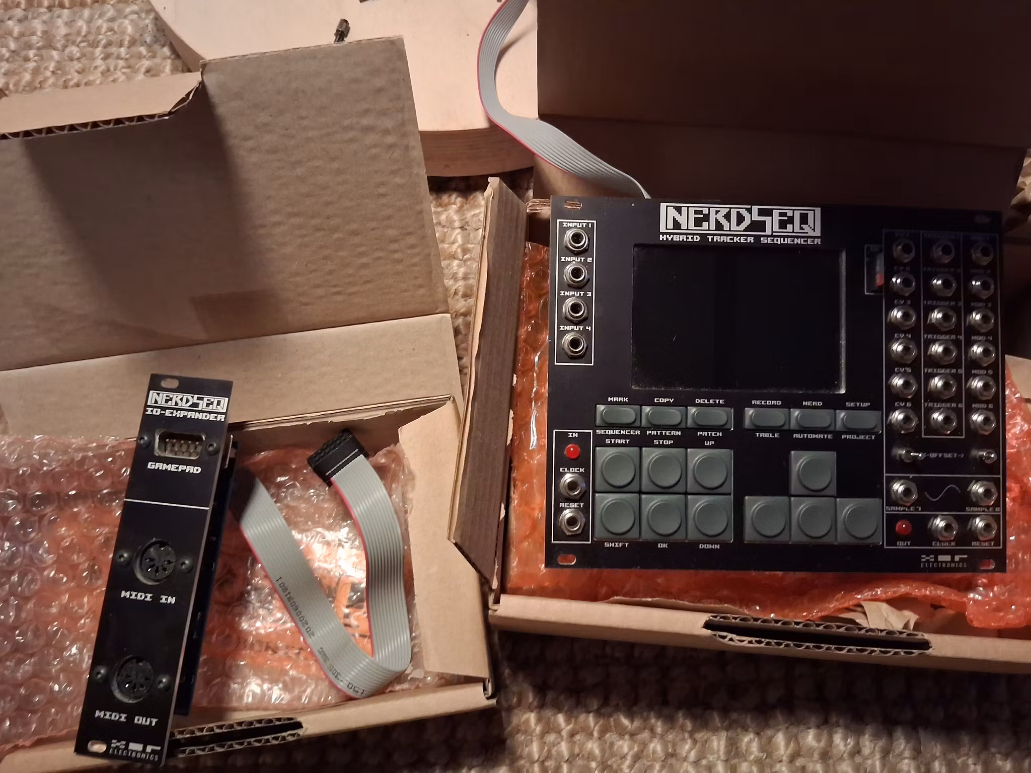 The NerdSeq can be expanded via a MIDI / gamepad module. It adds MIDI DIN connectors as well as a game port for Sega controllers.