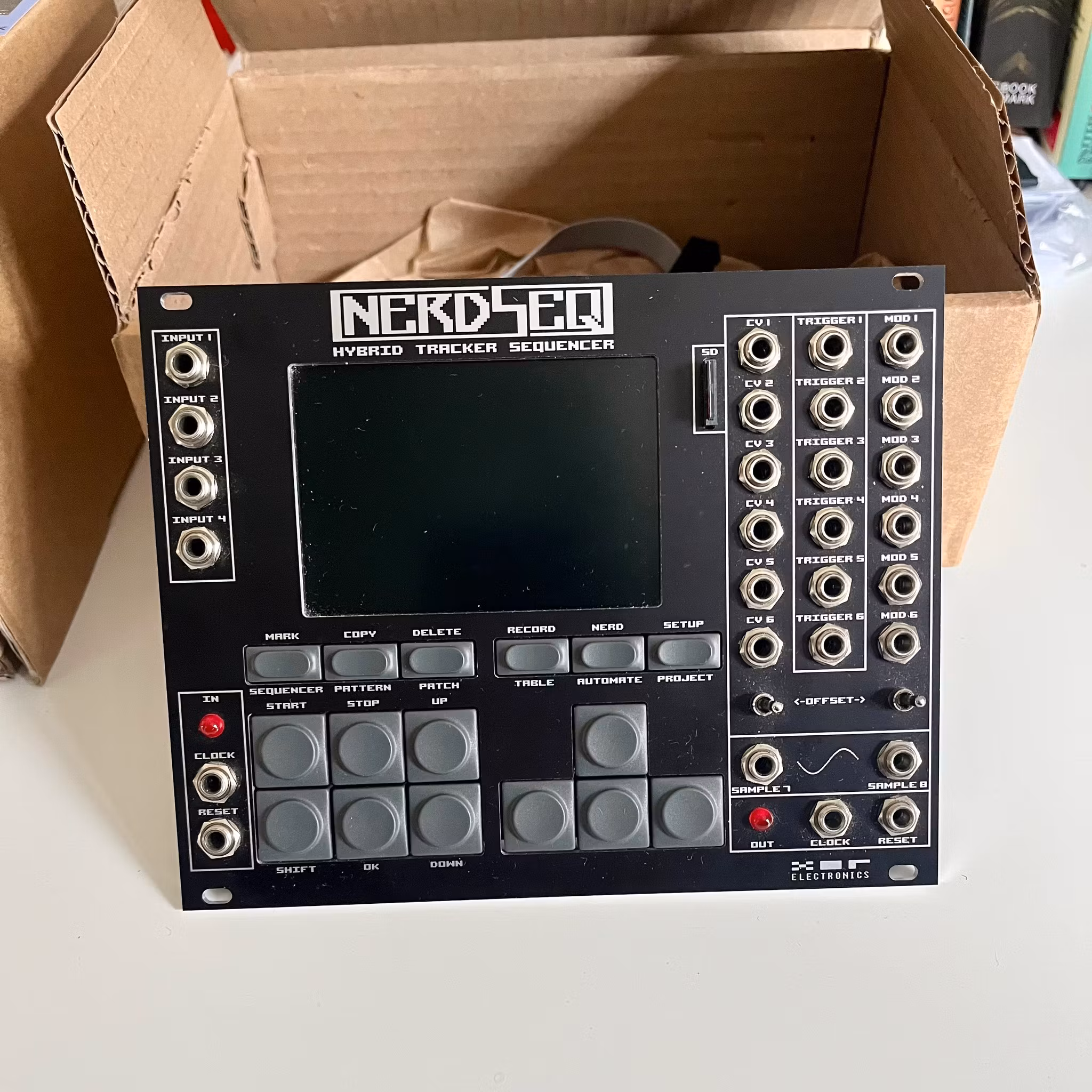 The NerdSeq is a sophisticated sequencer with tracker user interface. It features six “analog” channels. Each track comes equipped with the following outputs: