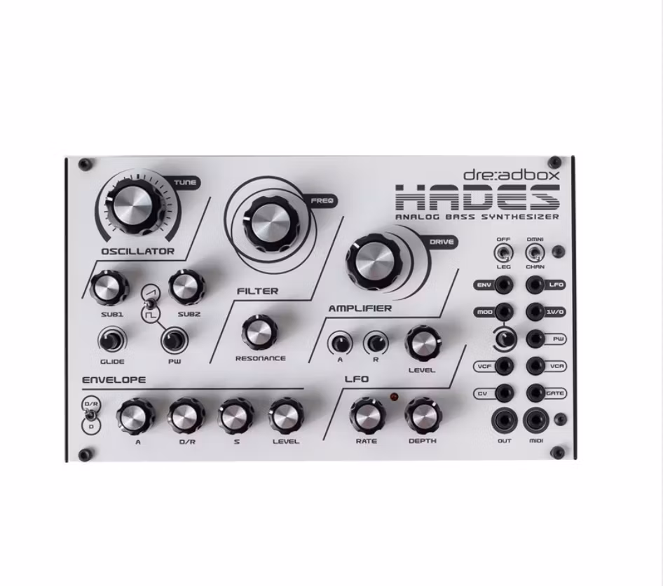 Hades ReissueDreadboxMonophonic analog bass synthesizer. 1x VCO with 2x sub octaves. 2x waveforms, saw and square, with PW control. 3-pole resonating low pass f